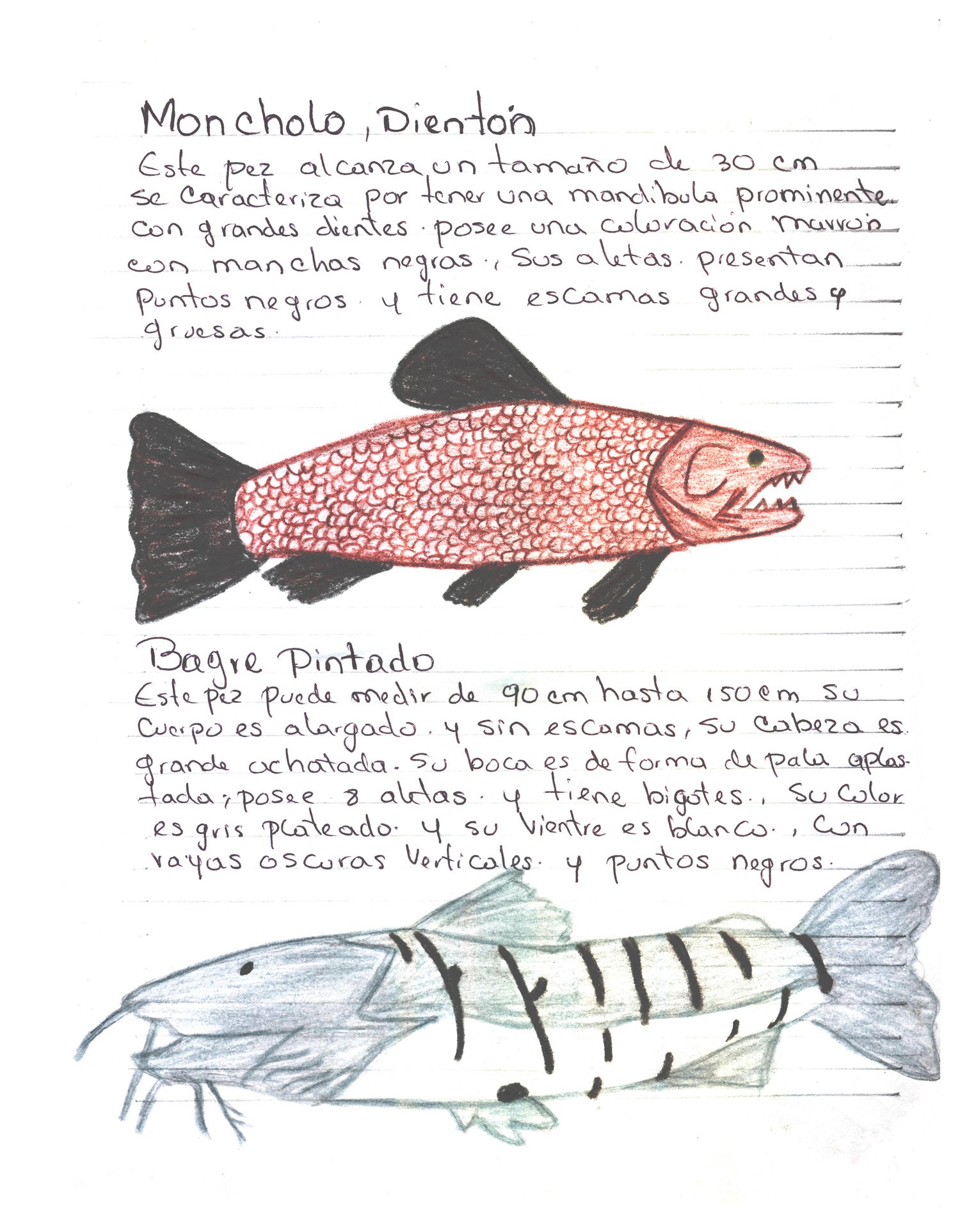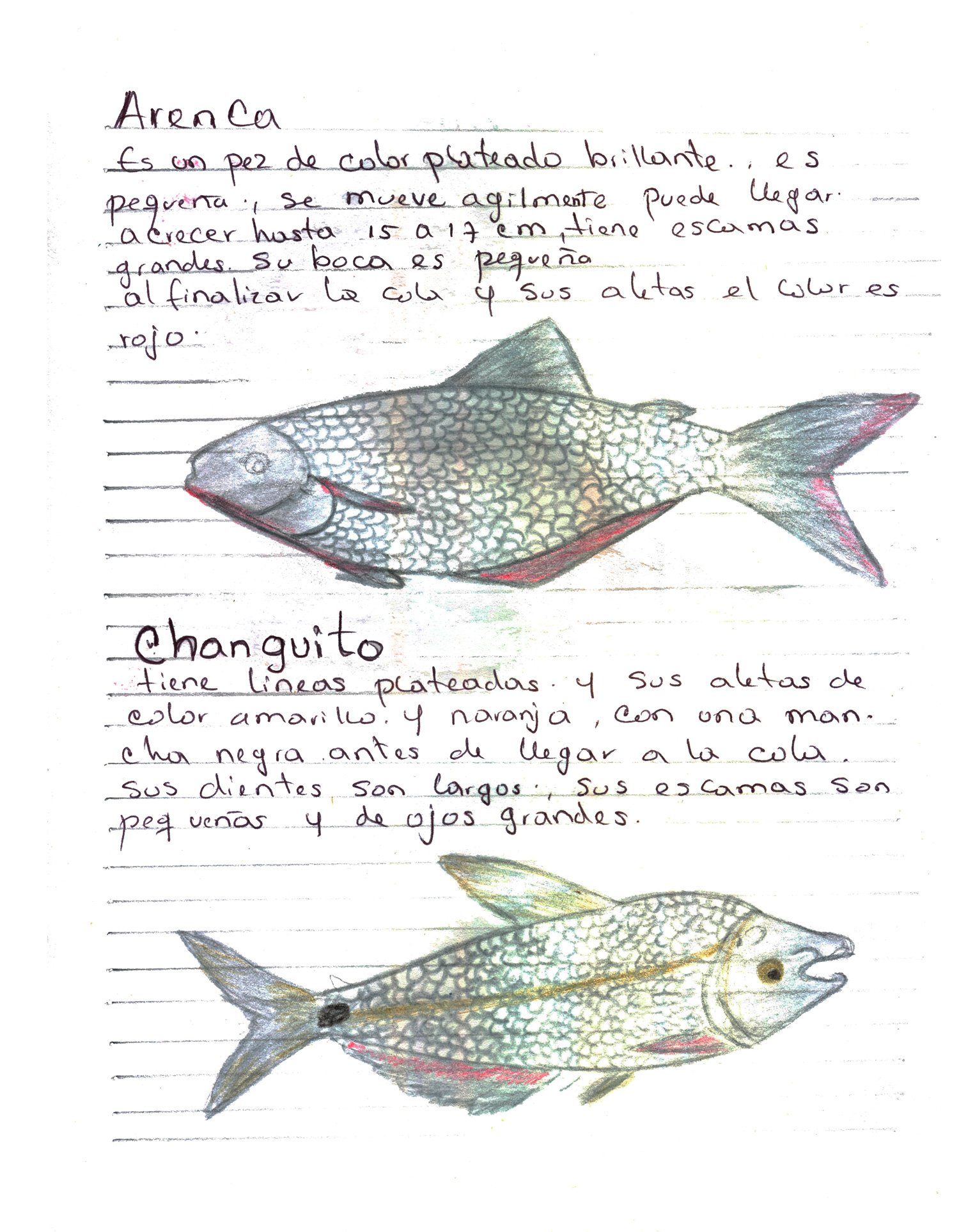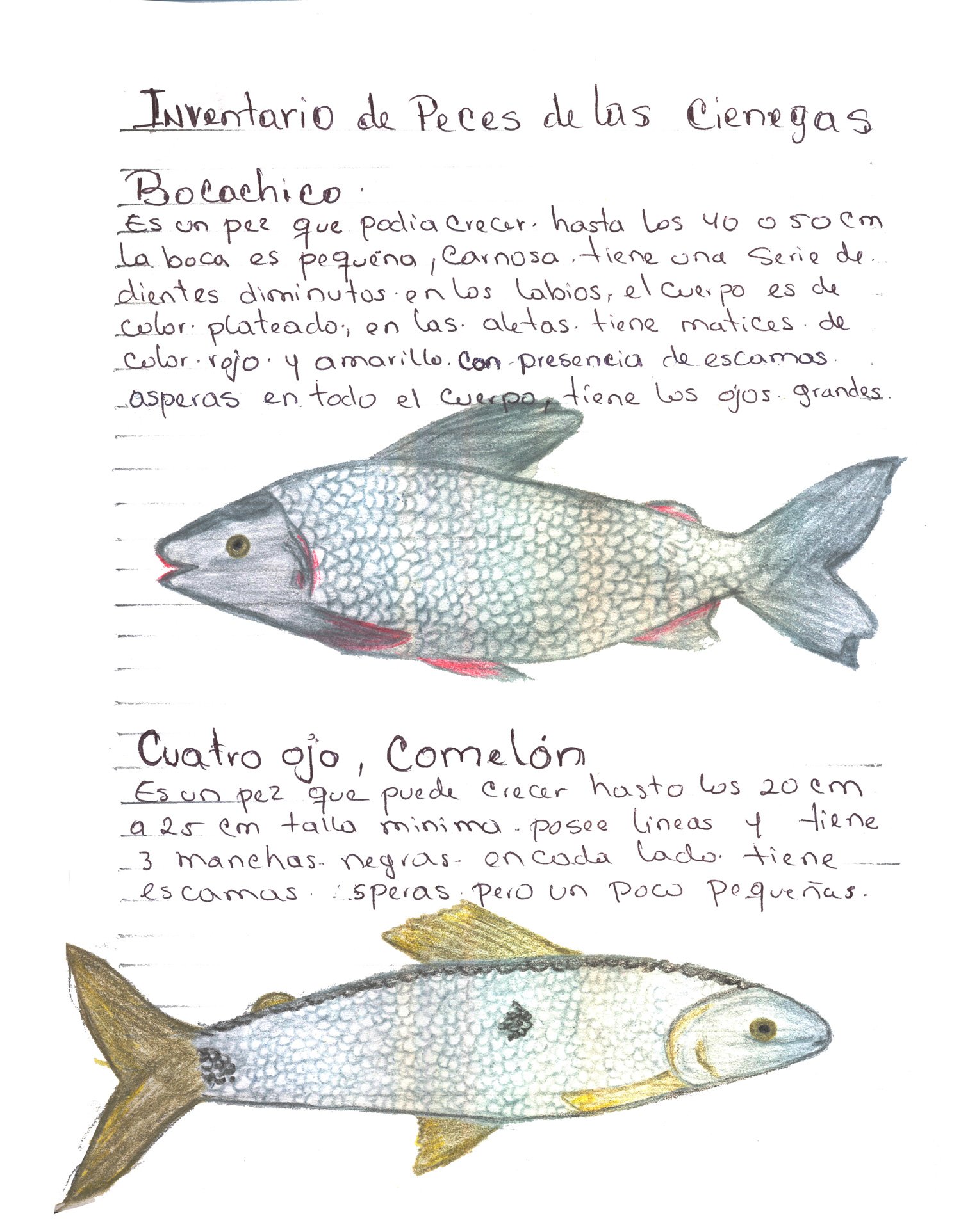 Peces de la ciénaga. Con estas ilustraciones el pescador y etnógrafo del proyecto, Jairo Enrique González Mercado, registra la memoria ambiental y el legado amenazado por la contaminación de las aguas, el cierre de las compuertas y las diversas problemáticas que están transformando drásticamente el territorio. Dibujos con lápices de colores sobre papel. Impresión digital 30 x 38.5 cm.