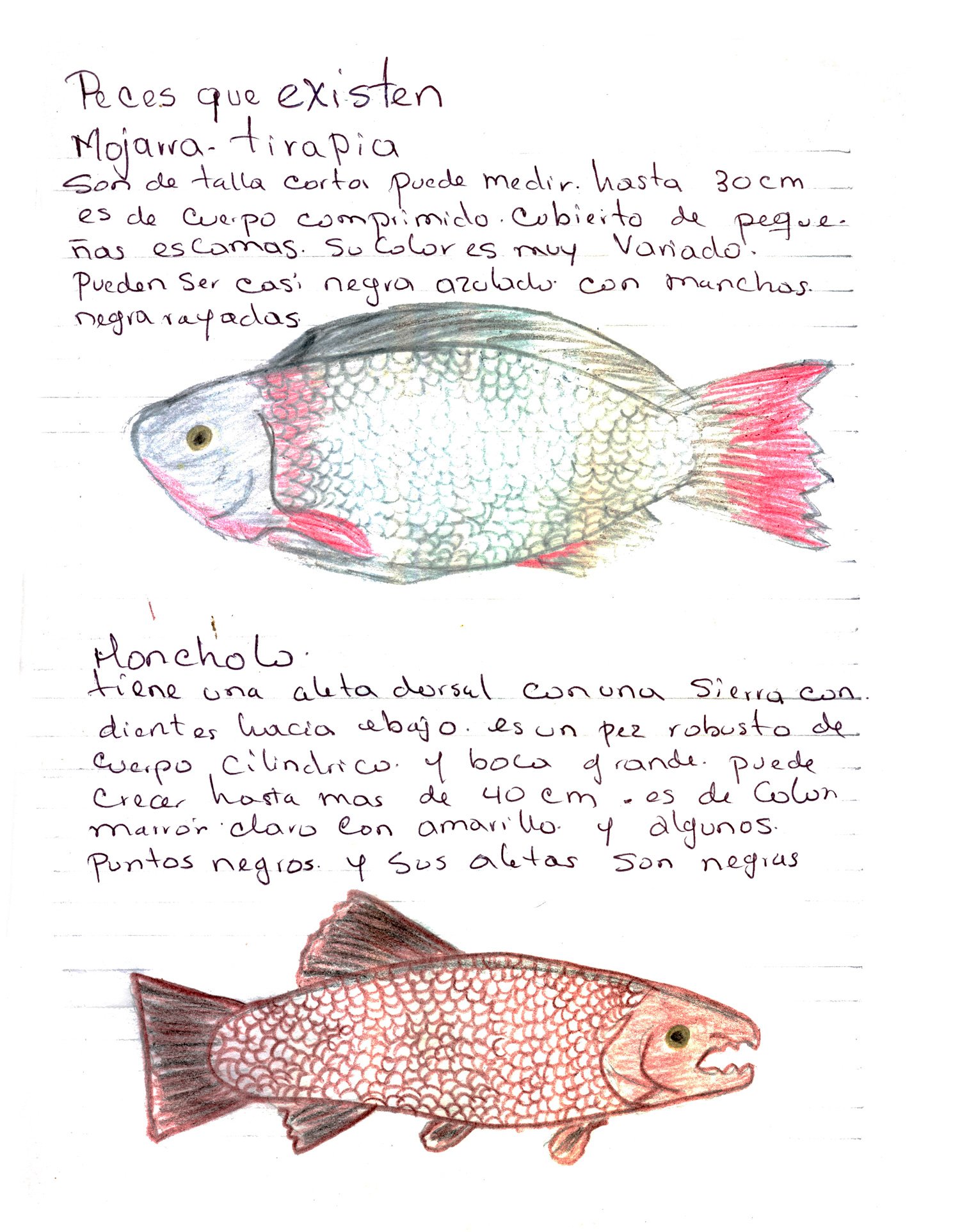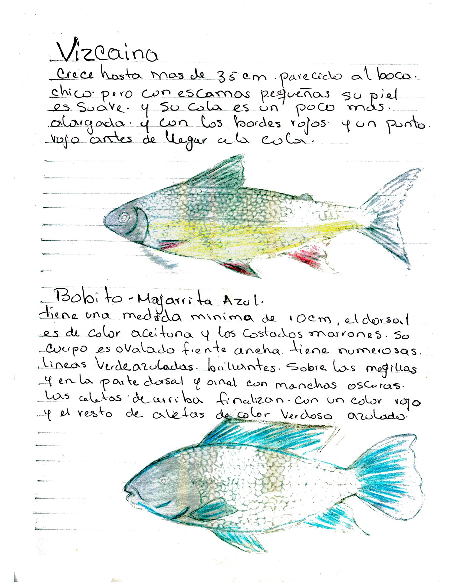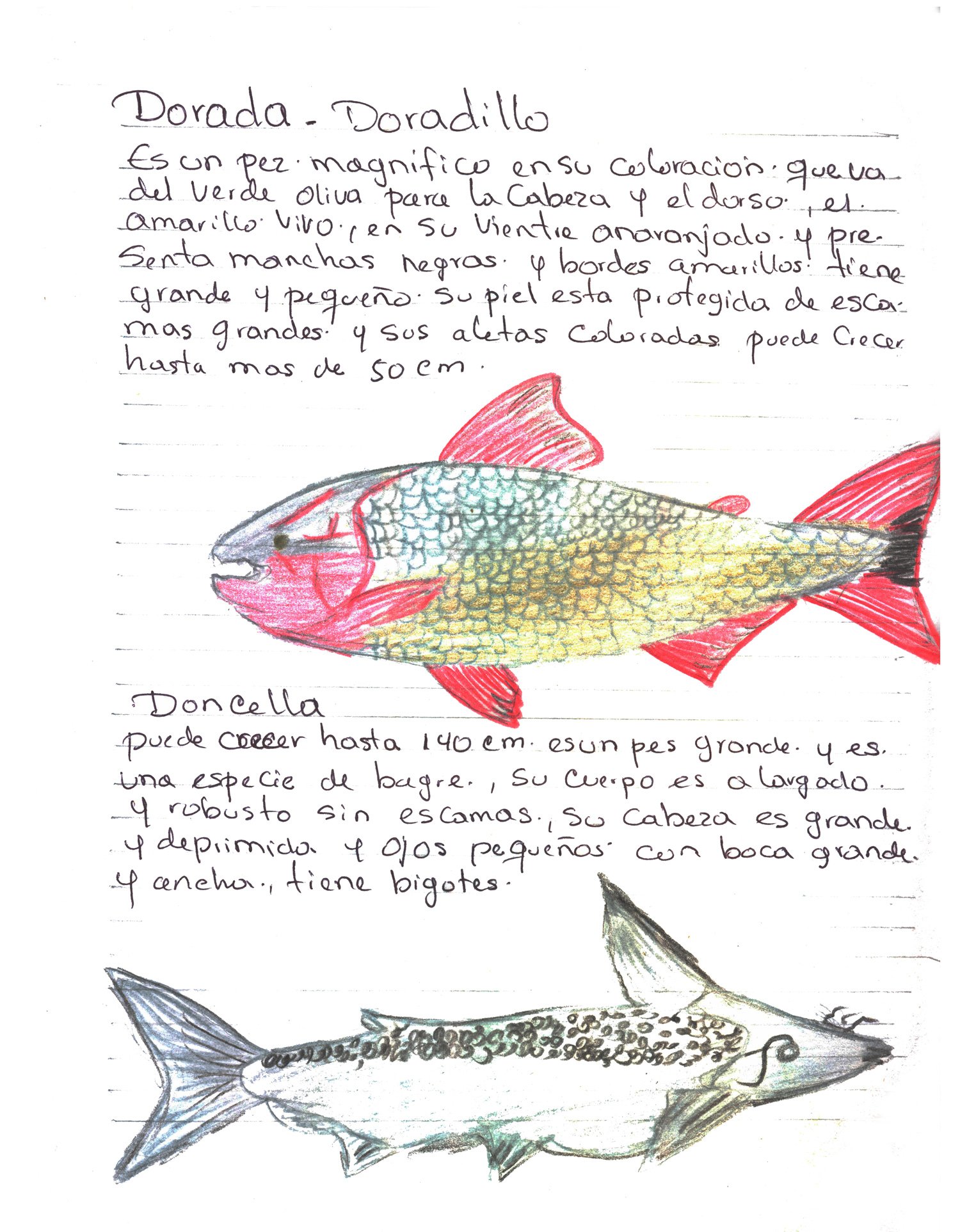 Peces de la ciénaga. Con estas ilustraciones el pescador y etnógrafo del proyecto, Jairo Enrique González Mercado, registra la memoria ambiental y el legado amenazado por la contaminación de las aguas, el cierre de las compuertas y las diversas problemáticas que están transformando drásticamente el territorio. Dibujos con lápices de colores sobre papel. Impresión digital 30 x 38.5 cm.