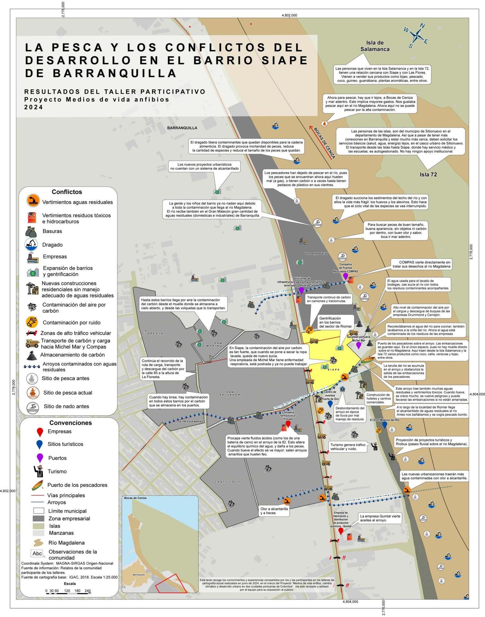 Entre mayo y junio de 2024, a través de talleres de cartografía social, los pescadores, pescadoras, ahumadoras, piangüeras, y diversificadoras plasmaron las historias y experiencias que han afectado el oficio de la pesca en los últimos años. Te invitamos a visitar estos mapas y los interactivos con sus testimonios.